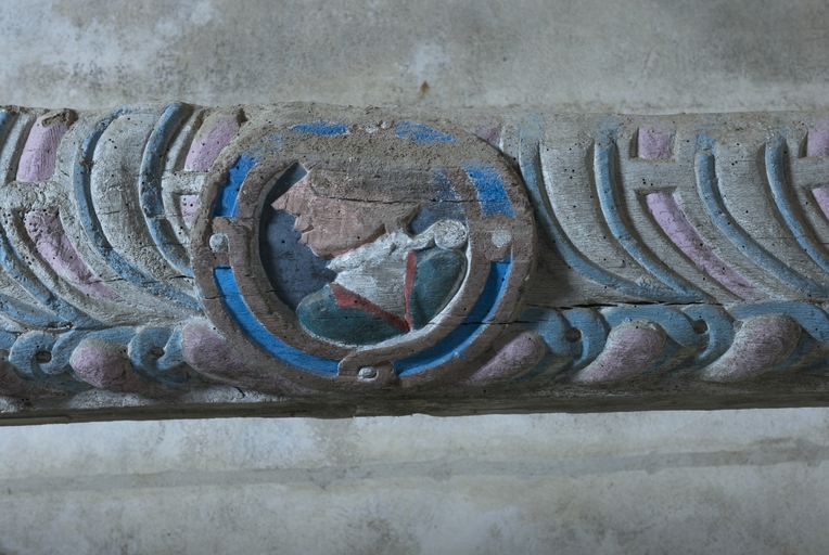 Loguivy-Plougras, le Dresnay : la chapelle Notre-Dame, vue de détail de la poutre de gloire de la nef, portrait de MadameImmatriculation