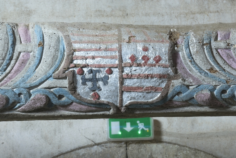 Loguivy-Plougras, le Dresnay : la chapelle Notre-Dame, vue de détail de la poutre de gloire de la nef, blasonImmatriculation