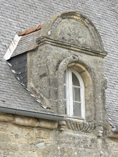 Détail, lucarne à fronton cintré avec tympan décoré d'un soleilImmatriculation