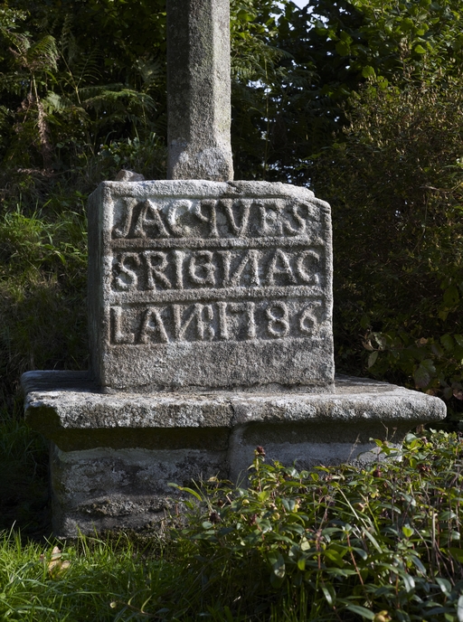 Loguivy-Plougras, Goaz Quéo : croix de chemin, détail du socle et du soubassement avec table moulurée. Le socle porte l'insciption suivante : JACQUES SCRIGNAC LAN : 1786Immatriculation