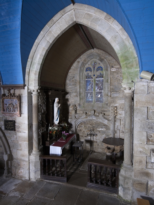 Plounévez-Moëdec, le bourg : église paroissiale Saint-Pierre, vue intérieure, chapelle des fontsImmatriculation