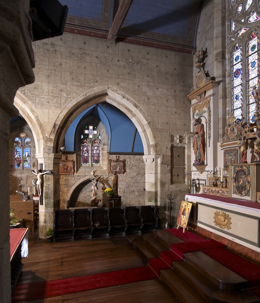 Plounévez-Moëdec, le bourg : église paroissiale Saint-Pierre, vue intérieure, détail du chœurImmatriculation