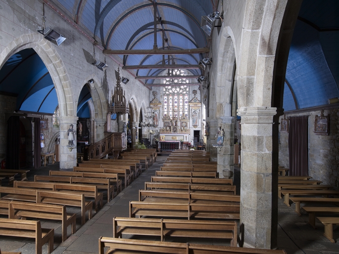 Plounévez-Moëdec, le bourg : église paroissiale Saint-Pierre, vue intérieure, chœurImmatriculation