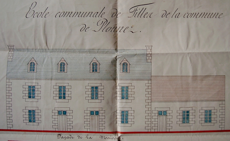 Ecole communale des filles de Plounez, plan du logement et des classes, élévations antérieures sur cour, 1874 (AD 22)Immatriculation