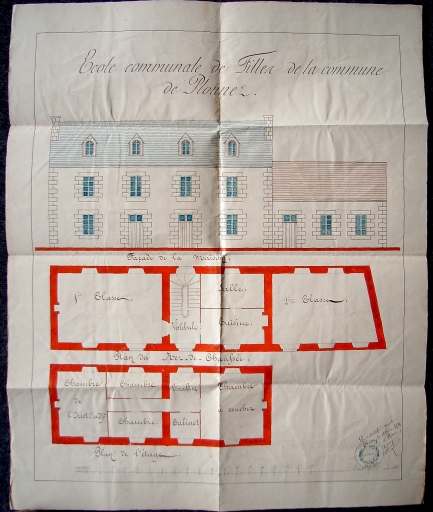 Ecole communale des filles de Plounez, plan du logement et des classes, élévations antérieures sur cour, rez-de-chaussée et étage, 1874 (AD 22)Immatriculation