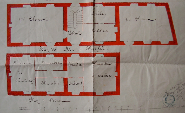 Ecole communale des filles de Plounez, plan du rez-de-chaussée et de l'étage du logement et des classes, 1874 (AD 22)Immatriculation