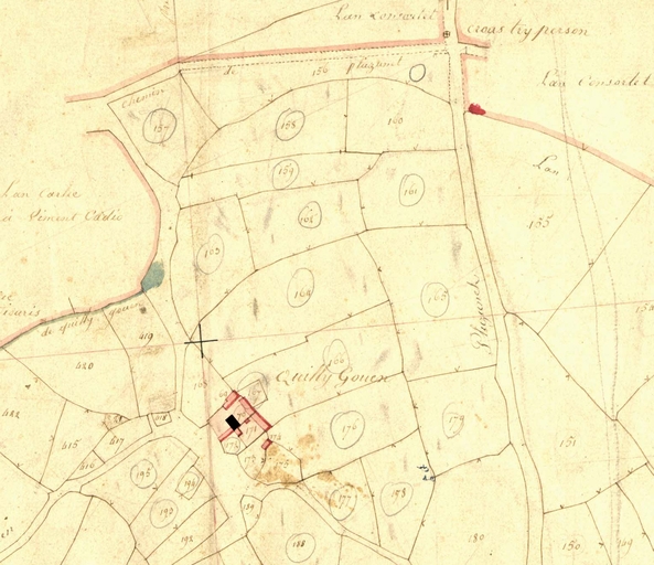 Extrait de la feuille A1 du cadastre ancien de la commune de Trégrom, 1834 : ferme ou manoir (?) de Quilly Gouen (en noir)Immatriculation