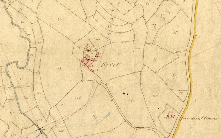 Extrait de la feuille D1 du cadastre ancien de la commune de Trégrom, 1834 : Kervod (Kervot)Immatriculation