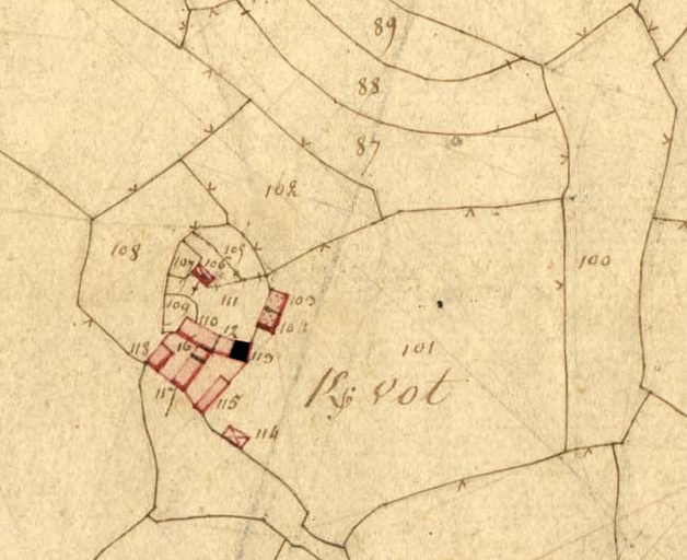 Extrait de la feuille D1 du cadastre ancien de la commune de Trégrom, 1834 : ferme de Kervod (Kervot) (en noir)Immatriculation