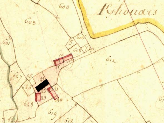 Extrait de la feuille A2 du cadastre ancien de la commune de Trégrom, 1834 : manoir de Kerhouars (en noir)Immatriculation