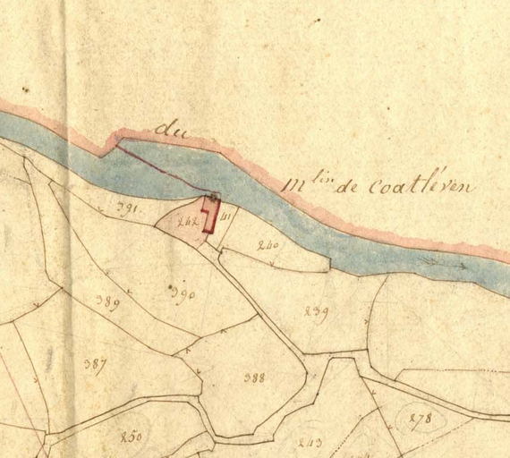 Extrait de la feuille D1 du cadastre ancien de la commune de Trégrom, 1834 : le moulin de Coat LévenImmatriculation