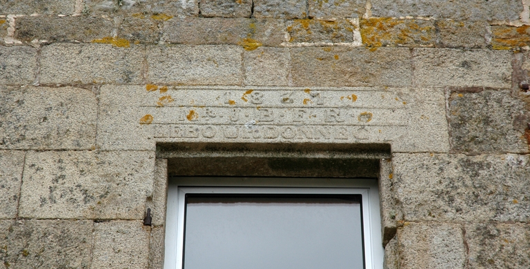Vue de la façade antérieure orientée au sud-sud-est : détail du linteau portant le millésime et l'inscription suivante : "1831 / Mr. J. B. F. R. / LE BOURDONNEC"Immatriculation