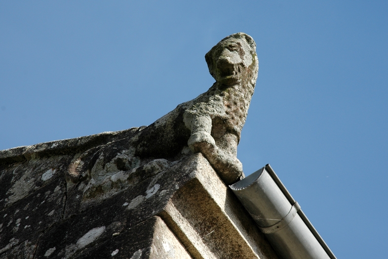 Vue du clocher-mur occidental : détail d'une crossette sculptée (remploi)Immatriculation