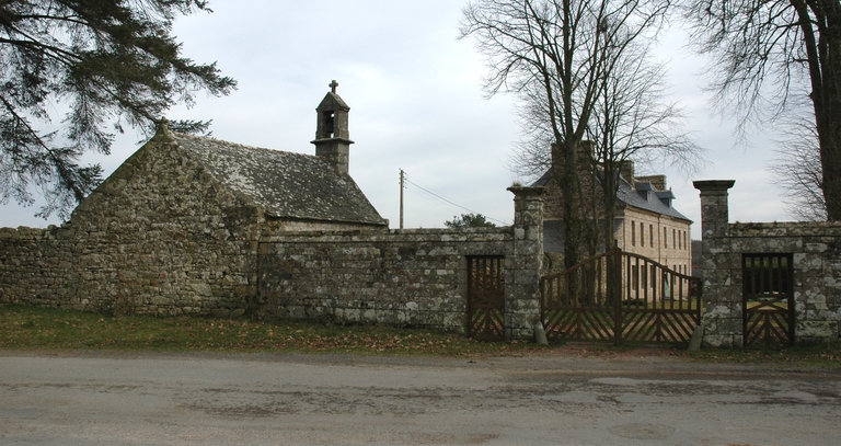 Vue de l'entrée monumentale : chapelle, portail encadré de deux piliers et demeureImmatriculation