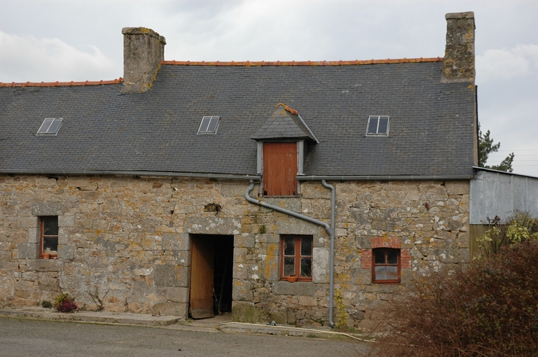 Vue de détail de l'élévation sud du logis. Une pierre de linteau en arc segmentaire est datée "1792" (située sous la lucarne)Immatriculation