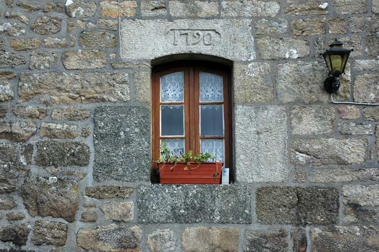 Elévation antérieure orientée vers l'ouest, détail du linteau en arc segmentaire portant le millésime 1790Immatriculation