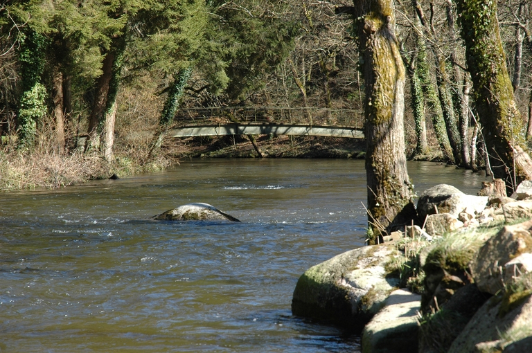 Vue du Léguer en aval du moulin. A l'arrière-plan : passerelle piétonneImmatriculation