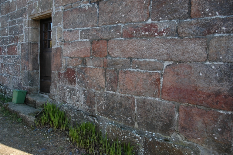 Vue de l'élévation postérieure orientée vers le nord : porte à chanfrein et détail de l'appareillage (la teinte rosée du granite pourrait être due à un incendie)Immatriculation