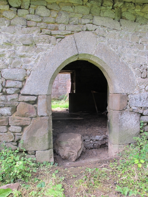 Trégrom, Gouern Braz (Le Grand Launay) : logis du 17e siècle transformé en étable, façade postérieure. Détail de la porte en plein cintre à chanfreinImmatriculation