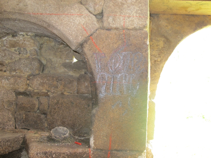 Trégrom, Gouern Braz (Le Grand Launay) : logis du 17e siècle transformé en étable, intérieur. Détail du vaisselier ; écriture gothiqueImmatriculation