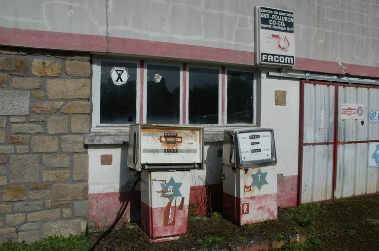 Trégrom, le bourg : ancien garage et station de carburant. Pompes à essenceImmatriculation