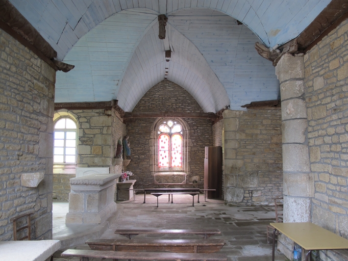 Plougras, le bourg : chapelle Saint-Gonéry, croisée. Lambris de couvrement peint en bleu et poinçons sculptés figurant des angelots ; entraits à engoulants et clé scumptée pendanteImmatriculation