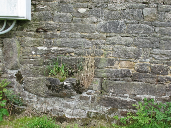 Plougras, Trogoaredec : ferme n° 1 datée 1865, façade postérieure, détail de l'exutoire de l'évier hérité d'un édifice antérieure (17e siècle)Immatriculation