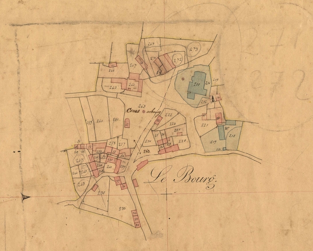 Extrait du cadastre ancien de la commune de Plougras, 1834 : le bourg (en bleu : l'église et son presbytère)Immatriculation