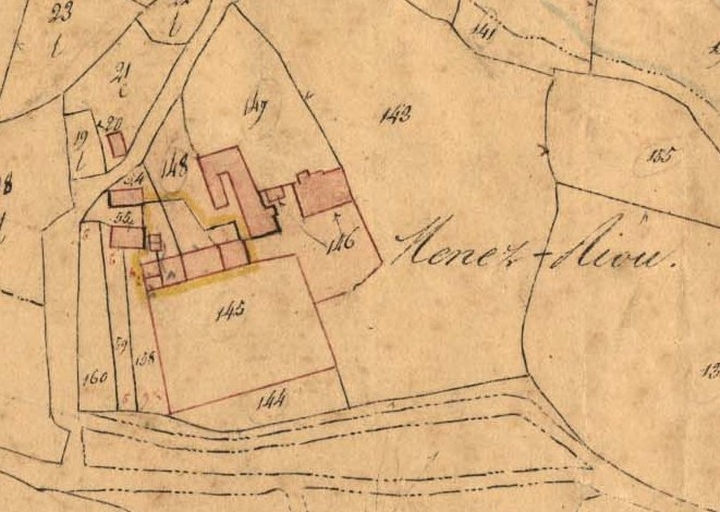 Extrait du cadastre ancien de la commune de Plougras, 1834 : le manoir de Menez RiouImmatriculation