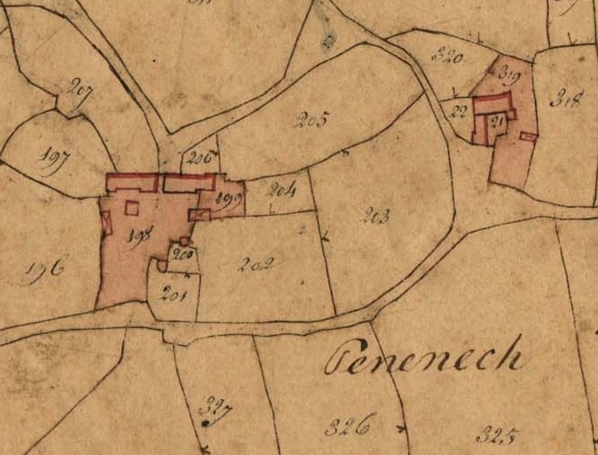 Extrait du cadastre ancien de la commune de Plougras, 1834 : la ferme de Pen an Nec'hImmatriculation