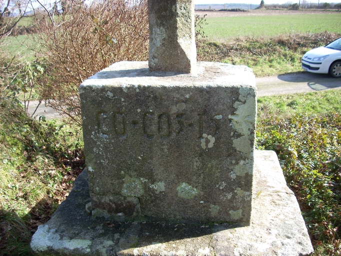 Loguivy-Plougras, Goaz Quéo : croix de chemin, détail du socle et du soubassement avec table moulurée. Le socle porte l'insciption suivante : CO - COZ - 1555Immatriculation