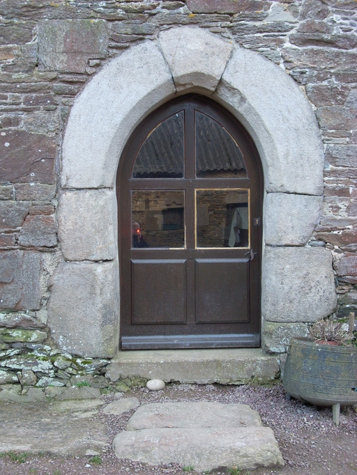 Loguivy-Plougras, le Dresnay : ancienne métairie noble, façade est, logis nord, détail de la porte en arc brisé datable du 16e siècleImmatriculation