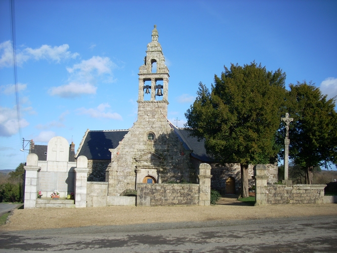 Loguivy-Plougras, le Dresnay : monument commémoratif aux déportés du Dresnay 21 mai 1944, vue de situation. A droite : la chapelle Notre-DameImmatriculation