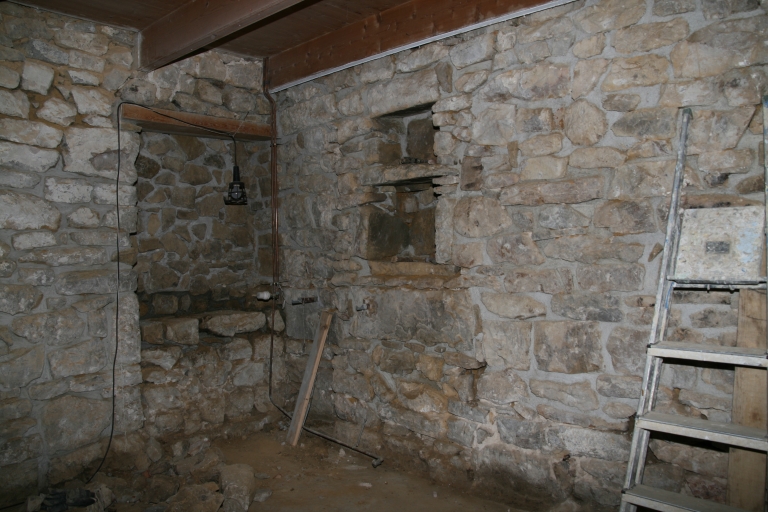 Détail intérieur d'un logis du 17e siècle avec niche à lit-clos et étagère muraleImmatriculation