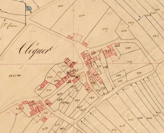 Le hameau de Cléguer en 1830. Extrait du cadastre ancien, section 9 (A.D. Finistère, 3P 45)Immatriculation