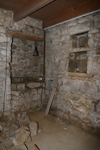 Montourgard. Logis de ferme du 17e siècle. Détail intérieur d'aménagement pour un lit-clos : encastrement dans le mur et étagère pour la lumièreImmatriculation
