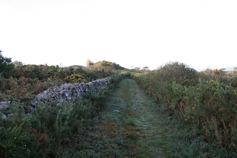 Cap de la Chèvre. Sentier et muret de pierre sèche dans la landeImmatriculation