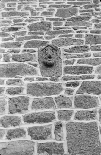 La Harilais, ferme, tête sculptée sur la façade postérieure.Immatriculation