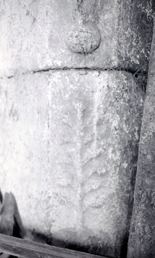Fougère sculptée, chanfrein du piédroit gauche, cheminée du rez-de-chaussée.Immatriculation