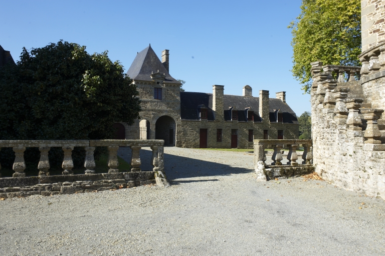 Vue sur le pavillon d'entrée et les communs depuis le châteauImmatriculation