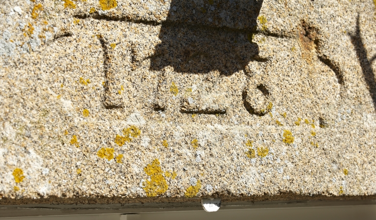 Détail du linteau, date sculptée.Immatriculation