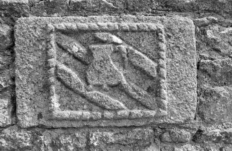 Détail d'une pierre portant des armes située sur un bâtiment annexe au sudImmatriculation