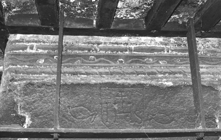 Bourg, maison 17e siècle, détail du linteau de cheminée.Immatriculation