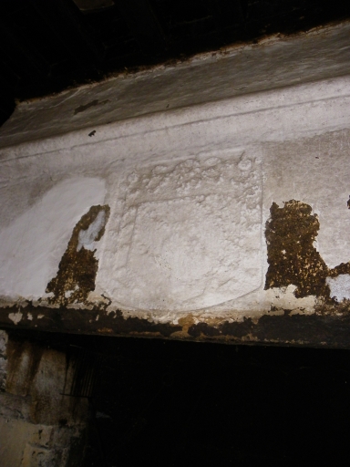 Cheminée du rez-de-chaussée, détail de l'armoirie sculptée.Immatriculation