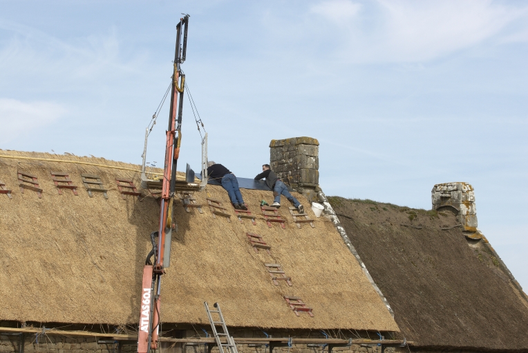 Mise en oeuvre de la nouvelle toiture de roseau sur la partie médianeImmatriculation