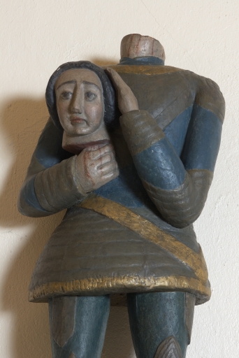 Statue de saint céphalophore, probablement Saint Symphorien, détail.Immatriculation