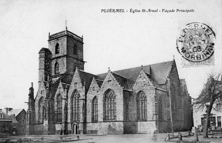 PLOËRMEL. Eglise St-Armel - Façade Principale. Carte postale, Ploërmel : H. Calindre, édit., [1er quart 20e siècle].