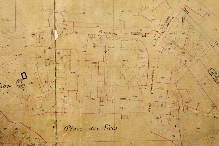 Plan cadastral 1844, section K8 : place des Lices et rue de la Basse-Cour. AM Vannes 21Fi.Immatriculation