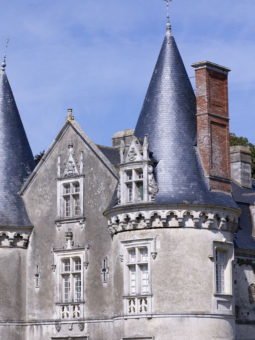 Château, logis, élévation ouest : partie supérieure de la tour sud et fronton (état en 2010)Immatriculation