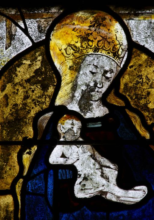 Verrière de la baie 1, lancette gauche : buste de la Vierge à l'Enfant (état en 2010)Immatriculation
